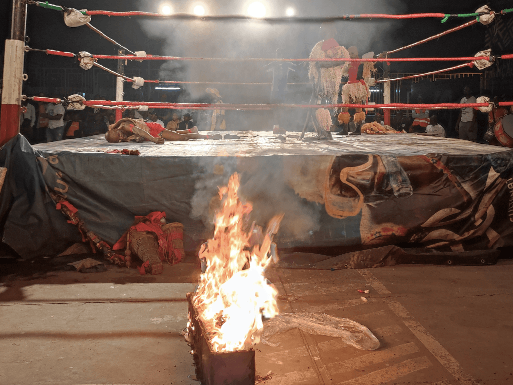 We thought we were going to watch a wrestling match. Instead, we ended up front row at catch fétiche: a baby coffin set on fire, smoke and panic in our faces, live snakes escaping into the crowd, and opponents moving like puppets under spells. Funny, cruel, chaotic and strangely beautiful in its imperfections. Read more