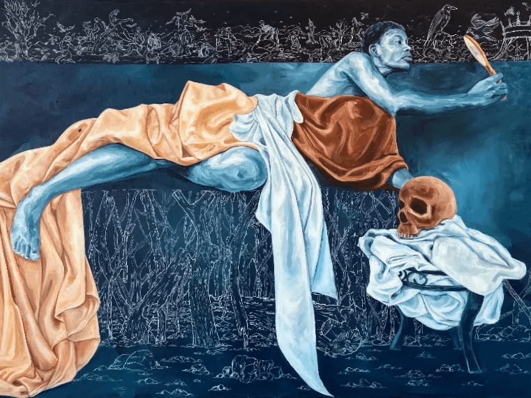 In this striking composition, Nyota revisits one of the oldest themes in the history of Western painting and brings it into conversation with the anxieties of her own generation. A reclining figure stretches across the canvas, body draped in folds of peach, ochre, and white, one arm extended toward a small hand mirror. Behind them, a dense frieze of finely drawn silhouettes, figures, trees, a crown, a bird, runs along the top of the canvas like a tapestry of ambition and memory. Below, a human skull rests on a draped stool, patient, unavoidable.